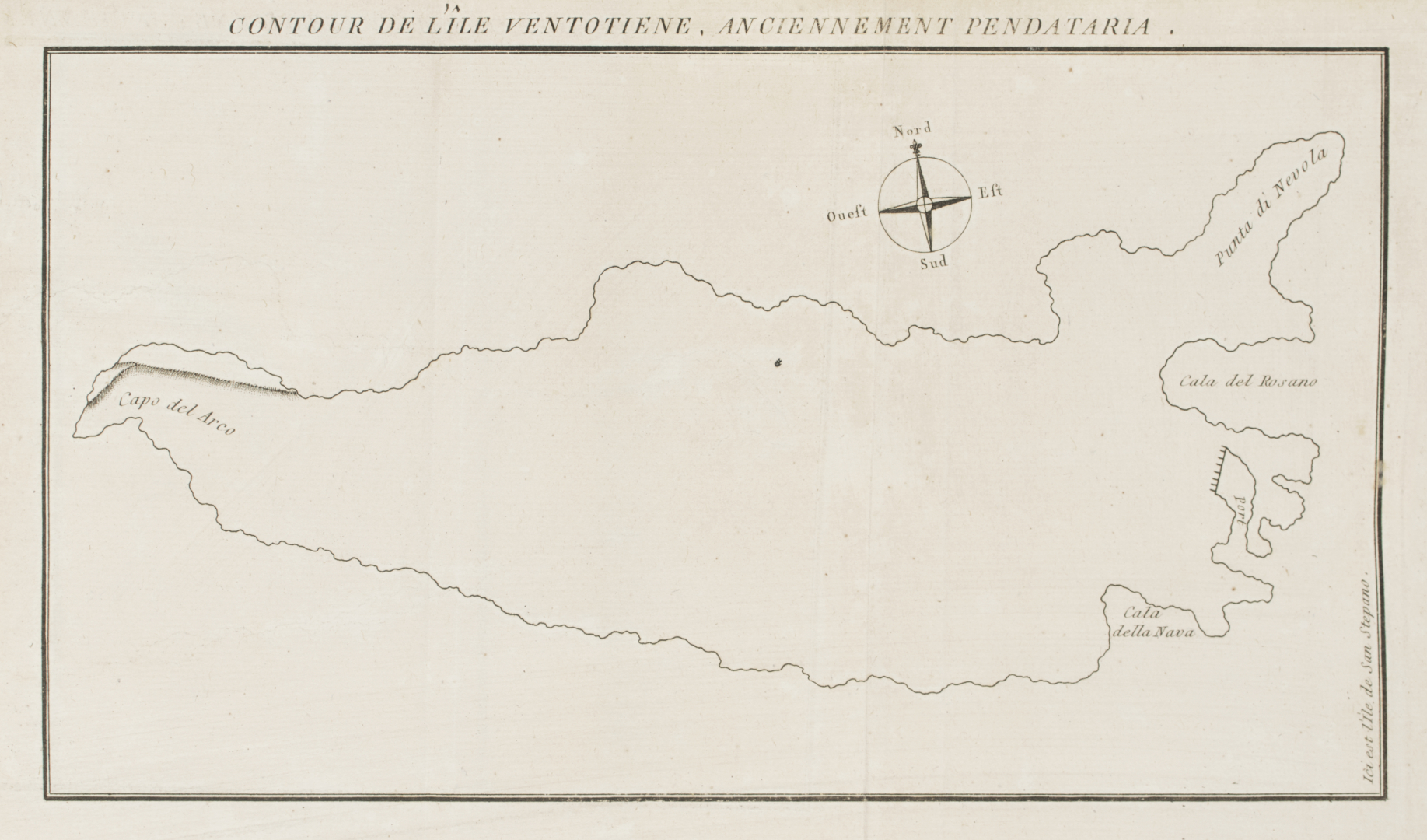 In 8° (187 x 122 mm); [2], vi, 525, [3] pagine. 1 tabella e 4 tavole incise e ripiegate raffiguranti Ponza, Palmarola, Ventotene e Zannone (piccoli difetti.) Legatura coeva in bazzana con fregi fitomorfi e titolo in oro al dorso, tagli a spruzzo (cerniere deboli).