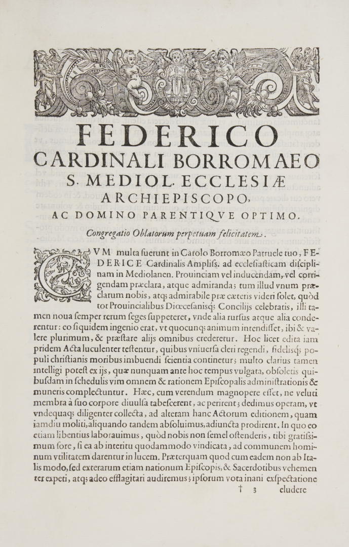 [Milano]. Esemplare marginoso e fresco della prima edizione dell'Acta Ecclesiae Mediolanensis. A Carolo Cardinali S. Praxedis archiepiscopo condita, Federici Carol. Borromaei archiepiscopi iussu undique diligentius collecta, & edita, uscita dai torchi di Pacifico da Ponte nel 1599 con frontespizio in rosso e nero con marca tipografica con numerazione continua, 3 tabelle ripiegate, entro legatura coeva in pergamena con titolo manoscritto al dorso (provenienza di biblioteca tedesca). L'opera contiene gli atti e decreti pastorali raccolti da San Carlo Borromeo, fatta pubblicare dal cugino Federico Borromeo. Venne in seguito ristampata più volte. L'opera è divisa in otto parti: Concili provinciali, Sinodi diocesani, Editti vari, Istruzioni varie, Istituzioni e regole di vario genere, Tabelle, Lettere pastorali, Formule varie.