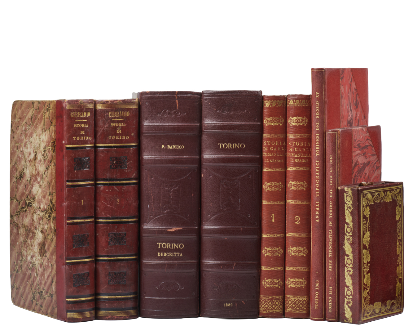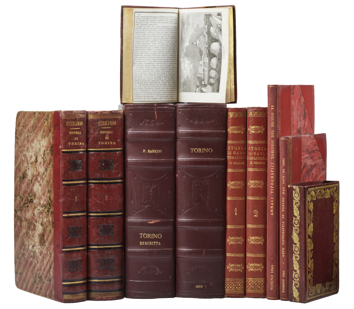 [Torino]. Bel lotto che riguarda Torino, con tra gli altri il Palmaverde 1840 con numerose tavole ed entro legatura coeva in marocchino bordeaux completamente decorato in oro ai piatti e al dorso, ed entro custodia, un esemplare fresco della Storia del re di Sardegna Carlo Emmanuele il grande di Giovanni Battista Semeria del 1831 in due volumi entro belle legatura, la Storia di Torino di Luigi Cibrario del 1846 in due volumi, Torino descritta da Pietro Baricco del 1869 in due volumi entro mezza legatura in pelle con brossure editoriali incluse, Cenni sull'origine e sui progressi dell'arte tipografica in Torino dal 1474 al 1861 entro legatura in mezzo marocchino rosso con angoli e titolo in oro in verticale al dorso, e un esemplare con barbe degli Annali tipografici torinesi del secolo XV di Giacomo Manzoni del 1863 entro legatura in mezzo marocchino rosso con angoli e titolo in oro al dorso in verticale.