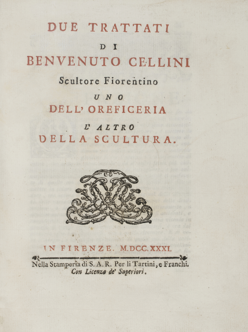 Cellini, Benvenuto. Due trattati ... Uno dell'Oreficeria l'altro della Scultura. Firenze, Giovanni Gaetano Tartini e Santi Franchi, 1731.