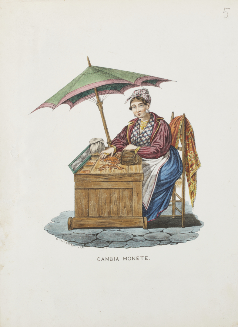 [Costumi]. Album in 4° oblungo in tela marrone con monogramma al piatto anteriore (227 x 338 mm) che contiene 34 tavole litografiche in bella coloritura a mano di circa 248 x 178 mm, raffiguranti scene popolari e costumi napoletani, con alcuni a firma di Giacomo Lenghi come Cambia monete o Rinaldo venditore di zeppole. Tra gli altri segnaliamo l'Acquajolo ambulante, la Discesa dal Vesuvio, o il Trionfo per Natale.