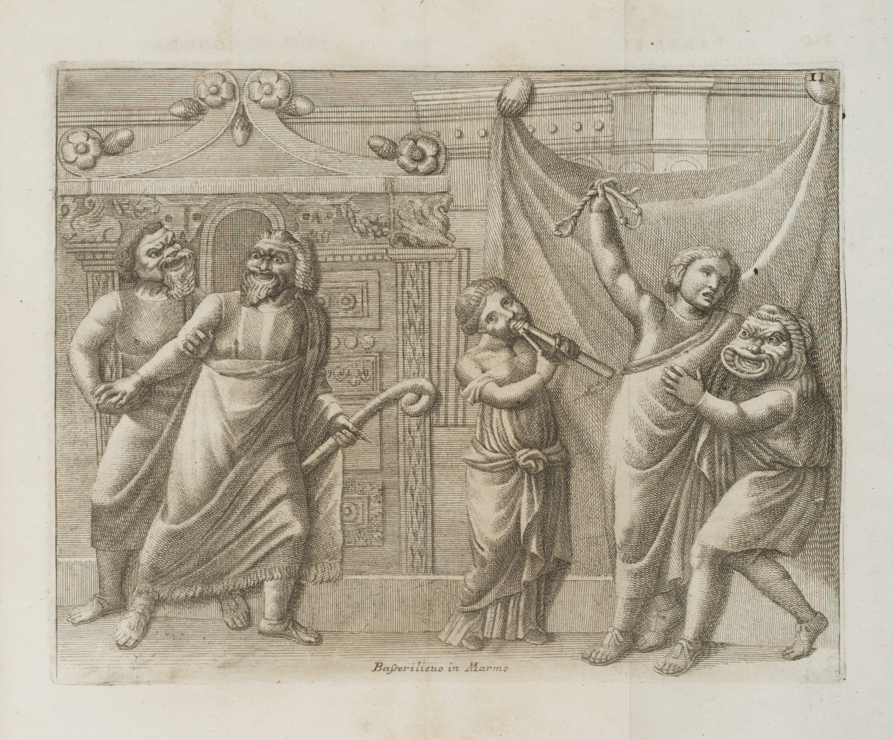 In 4° (277 x 203 mm); XII, 345, [1] pagine. Frontespizio in rosso e nero con emblema calcografico degli Arcadi, iniziali, fregi e finalini xilografici, 6 tavole di cui 1 ripiegata che riproduce un bassorilievo in marmo con scena di commedia antica (fioriture, soprattutto marginali.) Legatura coeva in pergamena, titolo in oro su tassello al dorso liscio, tagli gialli.