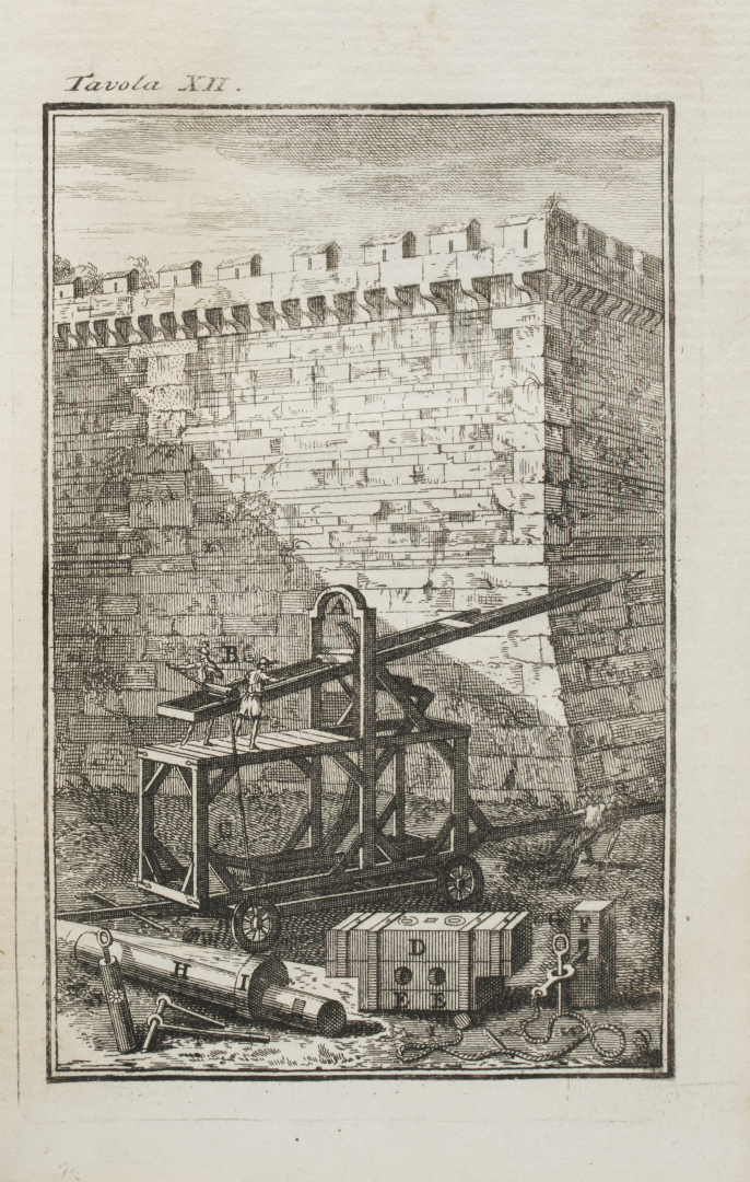 In 8° (160 x 100 mm). Antiporta incisa, 12 tavole incise e numerate, una delle quali ripiegata; l'ultima raffigurante una catapulta (piccoli difetti.) Legatura coeva in pergamena con titolo in oro entro cartiglio al dorso liscio, tagli marmorizzati.