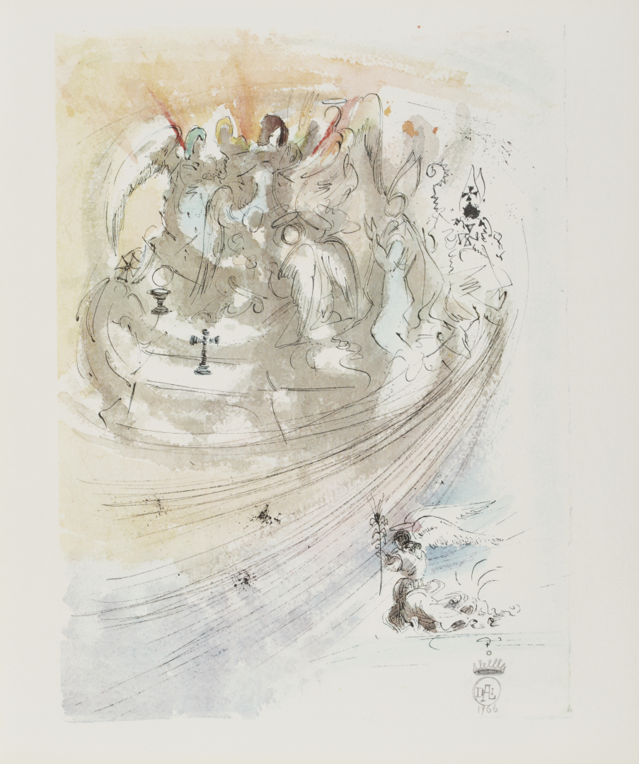 [Dalì]. Esemplare freschissimo del Pater Noster di Dalì nell'edizione milanese di Rizzoli del 1966 con [26] carte, 1 fotoriproduzione a colori fuori testo e 8 tavole a colori protette da carta di Cina, testo in diverse lingue, entro legatura editoriale in seta azzurra con titolo e autore impressi in oro al centro del piatto superiore.