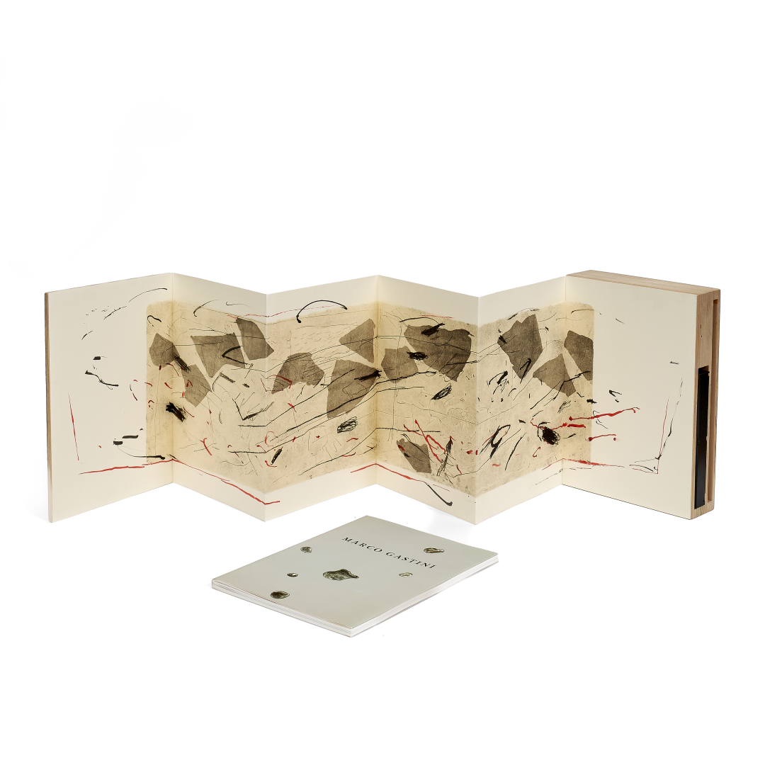 Rara edizione d'arte entro contenitore in legno sagomato (310 x 220 x 75 mm), che racchiude un'incisione originale (250 x 1000 mm), ripiegata e stampata a mano con torchio a stella su carta di riso giappone. Esemplare fuori commercio, con firma dell'artista e n. 4/10. Nella custodia lignea anche la videocassetta originale della mostra presso la Galleria d'Arte Moderna Villa delle Rose e il catalogo Marco Gastini, stampato a Firenze da Hopeful Monster e curato da Pier Giovanni Castagnoli, con un testo dello stesso Gastini e numerose fotografie a colori. Nel lotto è inoltre compreso il raro Partitura per otto tempi di Marco Gastini, edito da Exit Edizioni, contenente una serigrafia firmata dall'artista e numerata 10/90, nonché il CD con la musica eseguita per la sua mostra "der Atem, die Luft, das Licht" all'Orangerie im Schosspark Belvedere di Weimar, nel luglio 1998.