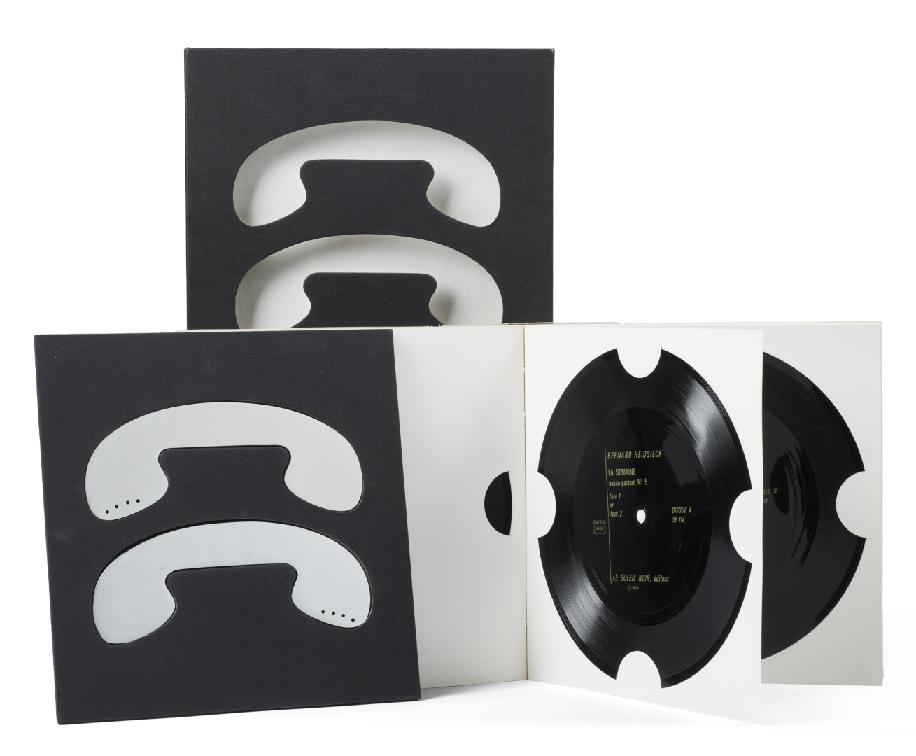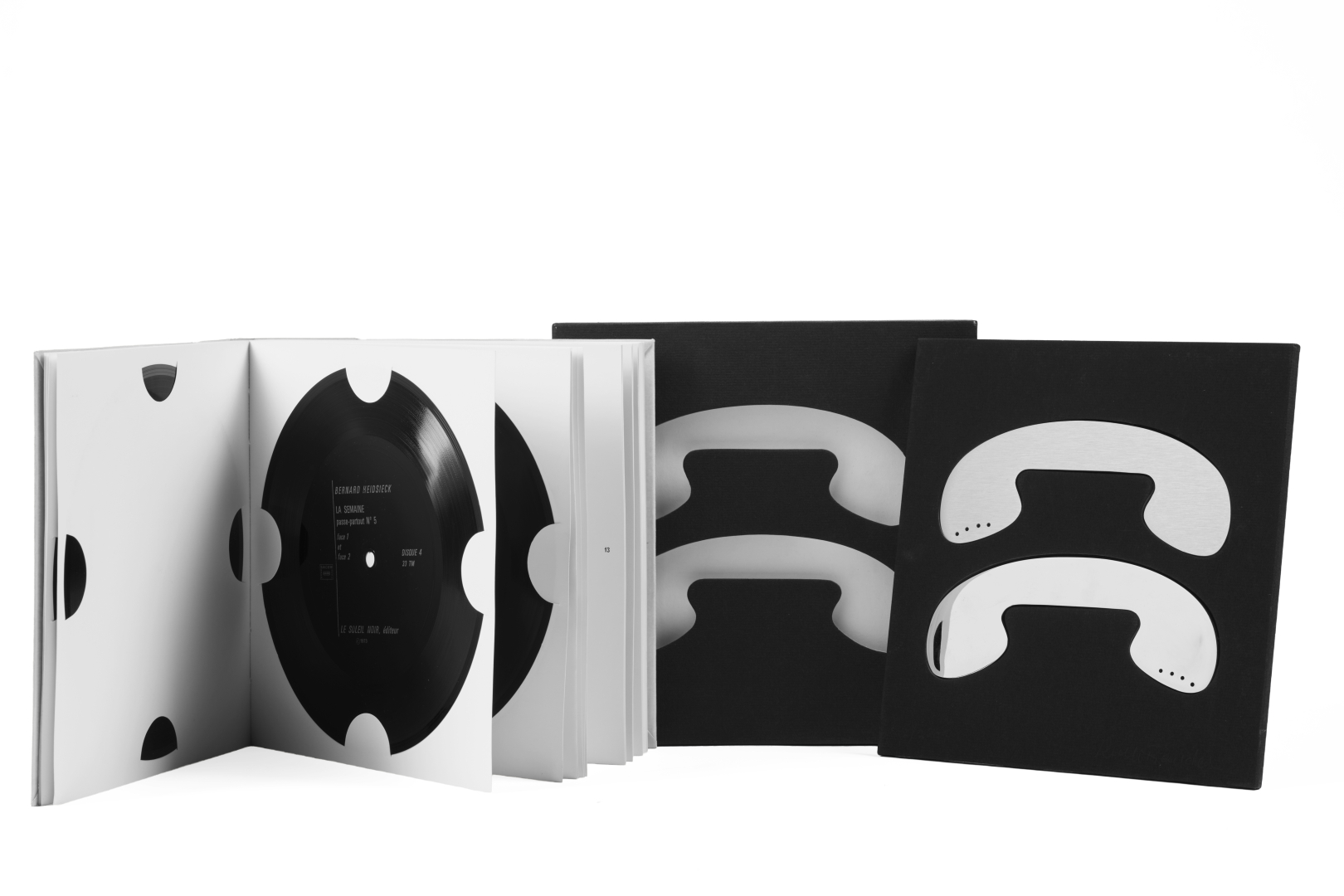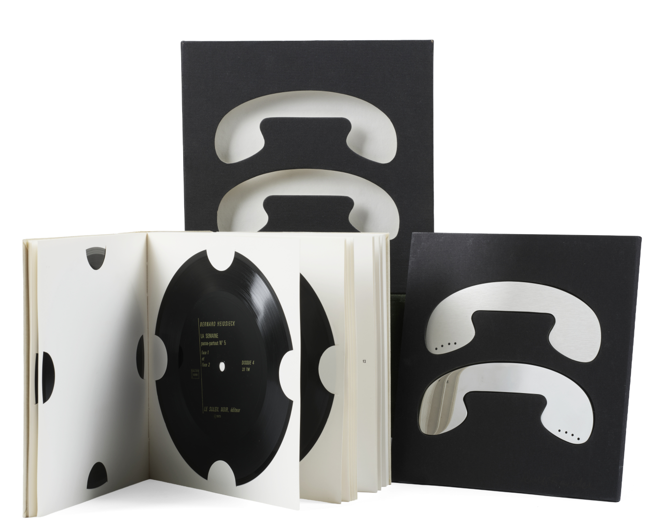 In 8° carré (190 x 190 mm). Con 6 dischi morbidi di cm. 18, uno dei quali posizionato sul piatto anteriore della brossura editoriale in cartoncino bianco, sovracoperta, astuccio in cartonato nero, nella parte superiore in un vano due profili di telefono realizzati uno in alluminio anodizzato, l’altro in acciaio cromato.