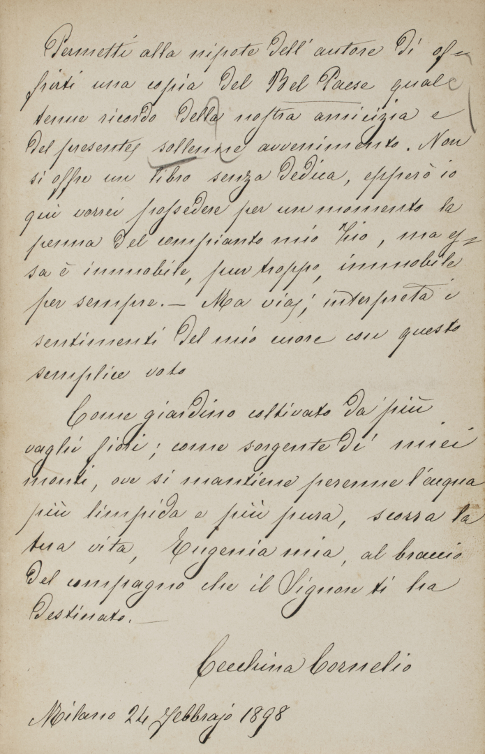 [Stoppani]. Il Bel Paese, Conversazioni sulle bellezze naturali, la geologia e la geografia fisica dell'Italia di Antonio Stoppani nell'edizione milanese di Cogliati del 1897 entro legatura in cartonato beige con fregi dorati al dorso e ai piatti, arricchito da una lunga dedica manoscritta da Cecchina Cornelio, nipote prediletta di Stoppani che visse per 18 anni a fianco del suo illustre zio. Ne ha divise le peripezie in alcuni viaggi, inoltre negli ultimi anni riferiva spesso con grande lucidità di mente e con giusto orgoglio molti episodi della vita dell'illustre zio.