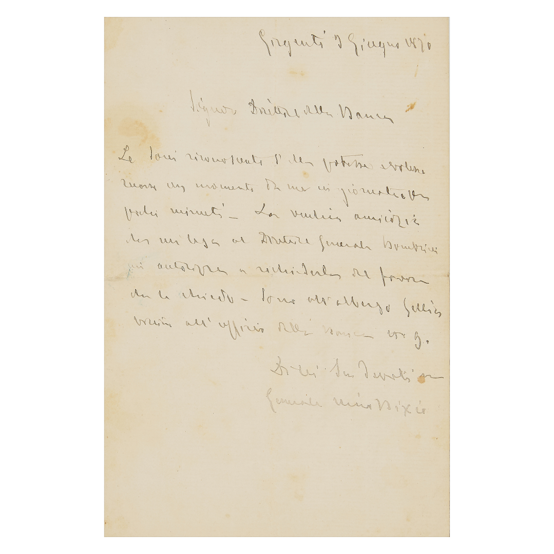 Bixio, Nino. Lettera autografa, 1 pagina in 8°, datata "Girgenti 9 giugno 1870" e firmata "Generale Nino Bixio", in cui il grande condottiero, protagonista del Risorgimento italiano e della Spedizione dei Mille, si rivolge al "Signor direttore della banca" locale per chiedere se possa recarsi "un momento da me in giornata per pochi minuti", anche in virtù della "vecchia amicizia che mi lega al Direttore Generale Bombrini", cioè Carlo Bombrini, fondatore della Banca di Genova e poi per molti anni direttore della Banca Nazionale. Ben conservata, pieghe e piccole macchie di umidità.