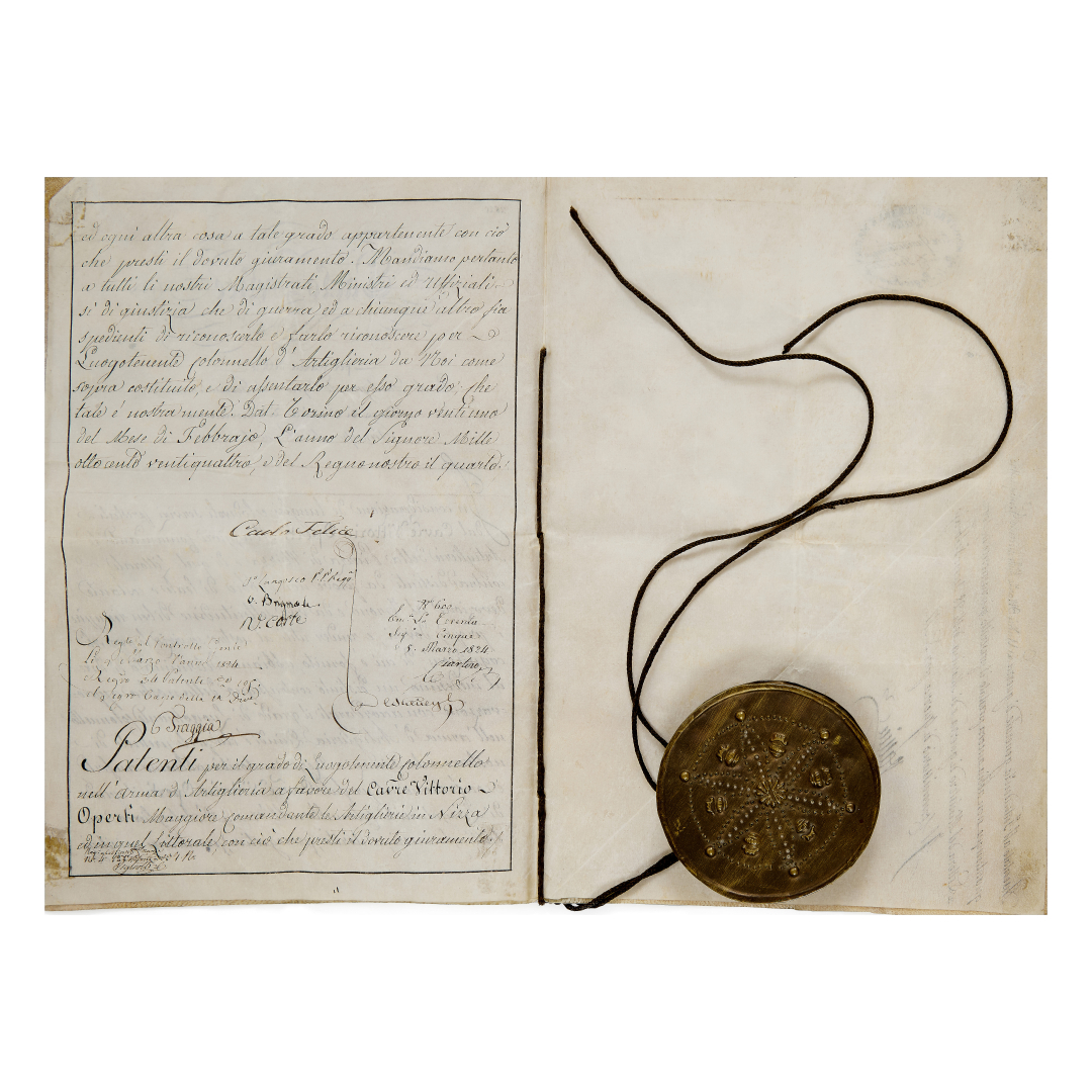 Carlo Felice di Savoia. Patenti con firma Carlo Felice Patente con firma autografa, 2 carte in 4°, con cui il sovrano, asceso al trono in seguito all'abdicazione del fratello Vittorio Emanuele I e responsabile della feroce repressione dei moti rivoluzionari del 1821, riconosceva al Cavaliere Vittorio Operti il "grado di Luogotenente Colonnello nell'arma d'Artiglieria", in considerazione delle sue "prove non dubbie di leale e costante devozione al trono". Il documento venne sottoscritto il 21 febbraio 1824, è protetto da rilegatura realizzata con un foglio di pergamena, alla quale è legato un sigillo metallico.