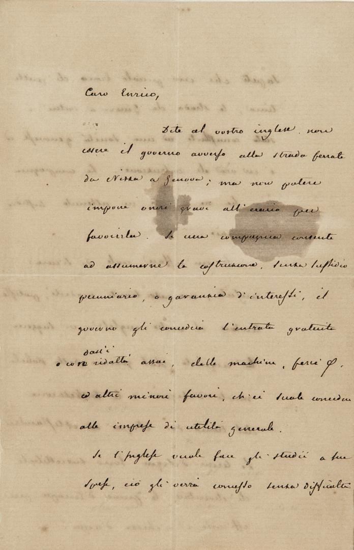 Cavour, Camillo. Cavour, Camillo. Lettera autografa firmata Lettera autografa firmata, 4 pagine in 8°, senza data, indirizzata ad un "Caro Enrico". Interessante epistola sul progetto di strada ferrata tra Nizza e Genova con tanto di indicazioni economiche sul costo dell’opera.