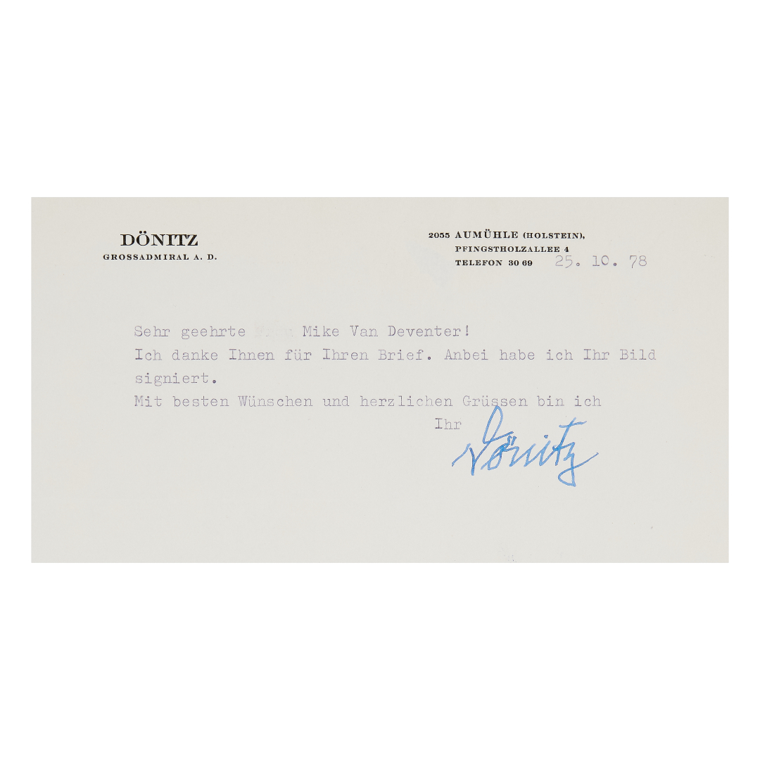 Dönitz, Karl. Breve lettera dattiloscritta, 1 pagina in 8° datata "25.10.78", con firma autografa dell'ammiraglio tedesco, comandante della flotta degli U-Boot durante la battaglia dell'Atlantico, il quale trattò con gli Alleati la resa finale della Germania Nazista, dopo la morte di Adolf Hitler. La lettera è accompagnata da certificato di autenticità di Todd Mueller Autographs. Il lotto include anche una firma autografa su busta filatelica americana primo giorno del 23 febbraio 1976, anch'essa unità a certificato di autenticità rilasciato dall'Associazione Autografia.