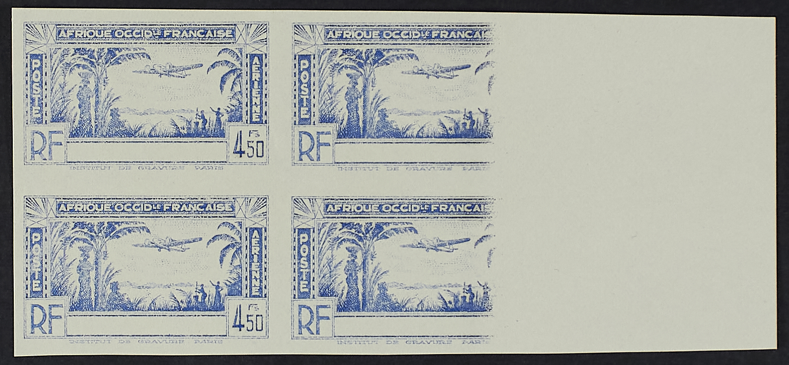 1940 - Pacchi postali - Tre prove non dentellate in azzurro senza legenda e in blocchi di quattro bordo di foglio a destra dei valori da 1,65 f., 2,65 f. e 4,50 f. con impressione parziale dei due esemplari a destra - Cert. Behr