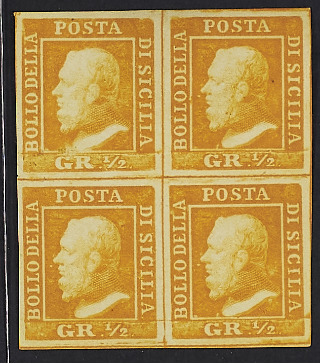 1859 - 1/2 gr. I tavola arancio blocco di quattro (pos. 23/24 - 33/34) - Cert. Bolaffi e Diena
