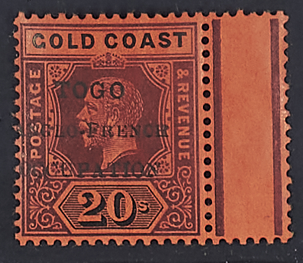 1916 - Occupazione anglo - francese 20 s. violetto e nero su carta rossa bordo di foglio a destra