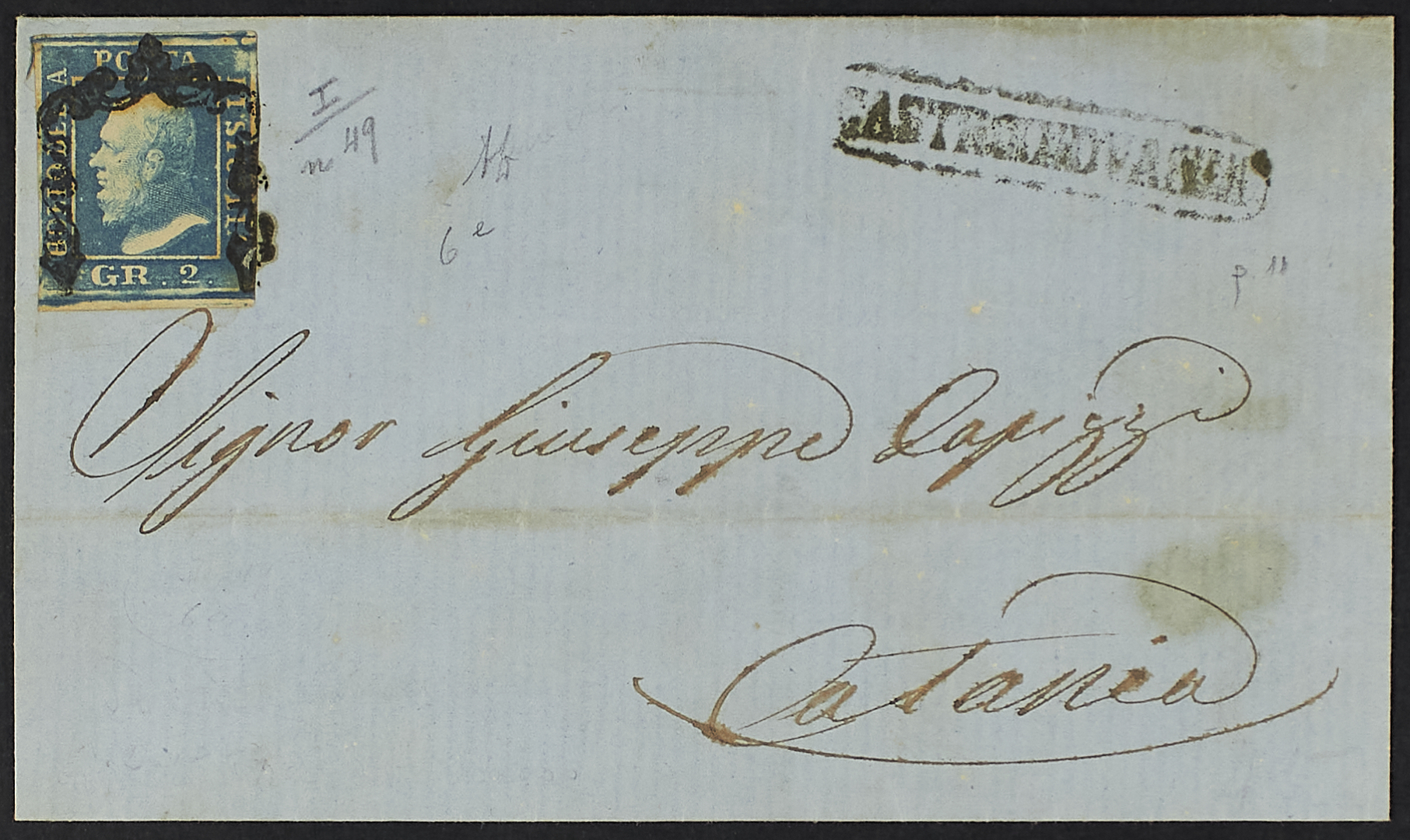 1859 - Castrogiovanni - Cartella sulla soprascritta di lettera del 6 aprile per Catania affrancata con 2 gr. I tavola azzurro