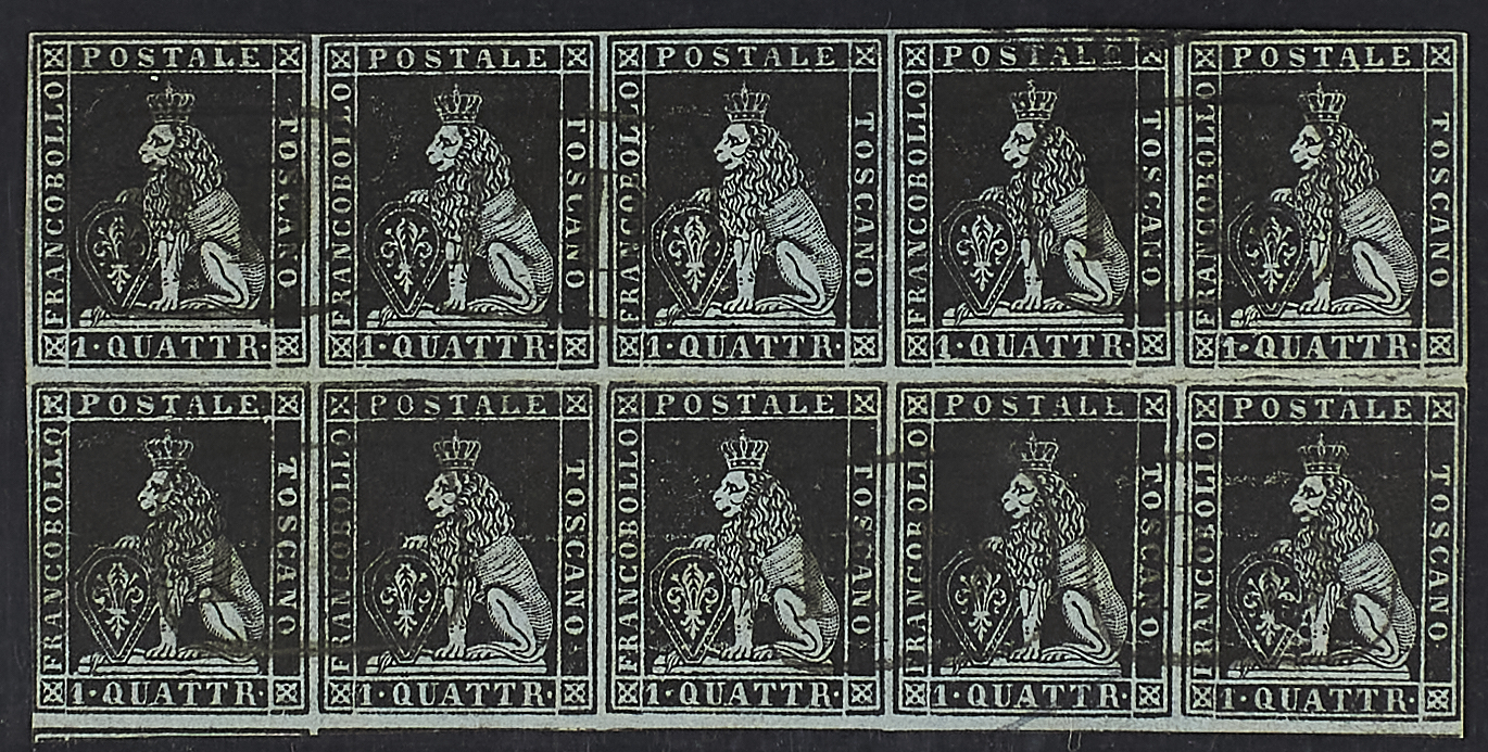 1852 - 1 q. nero su carta azzurra blocco orizzontale di dieci esemplari annullato con cartella "P.D." - Lieve piega centrale a destra che ha prodotto un'"apertura" in corrispondenza della filigrana ma multiplo estremamente raro e di eccellente aspetto - Ex collezione Riccardo Garrone (asta Spink Londra, 8 giugno 2000, lotto 268) - Cert. Diena - Firme Grioni e Raybaudi