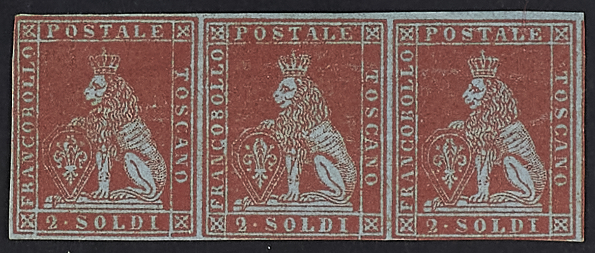 1851 - 2 s. scarlatto su carta azzurra striscia orizzontale di tre esemplari - Ben marginato e di eccezionale freschezza - Unico multiplo nuovo esistente del 2 s. e grande rarità di Toscana - Ex collezione Ferrary de la Renotière, Caspary e Riccardo Garrone (asta Spink Londra 80 giugno 2000, lotto 271) - Cert. Diena