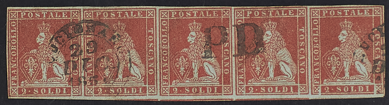 2 s. scarlatto chiaro su carta azzurra striscia orizzontale di cinque esemplari annullato con bollo a date di Lucignano e con bollo "P.D." - Molto rara ed eccezionalmente conservata - Ex collezione Riccardo Garrone (asta Spink Londra, giugno 2000, lotto 273) - Cert. Diena