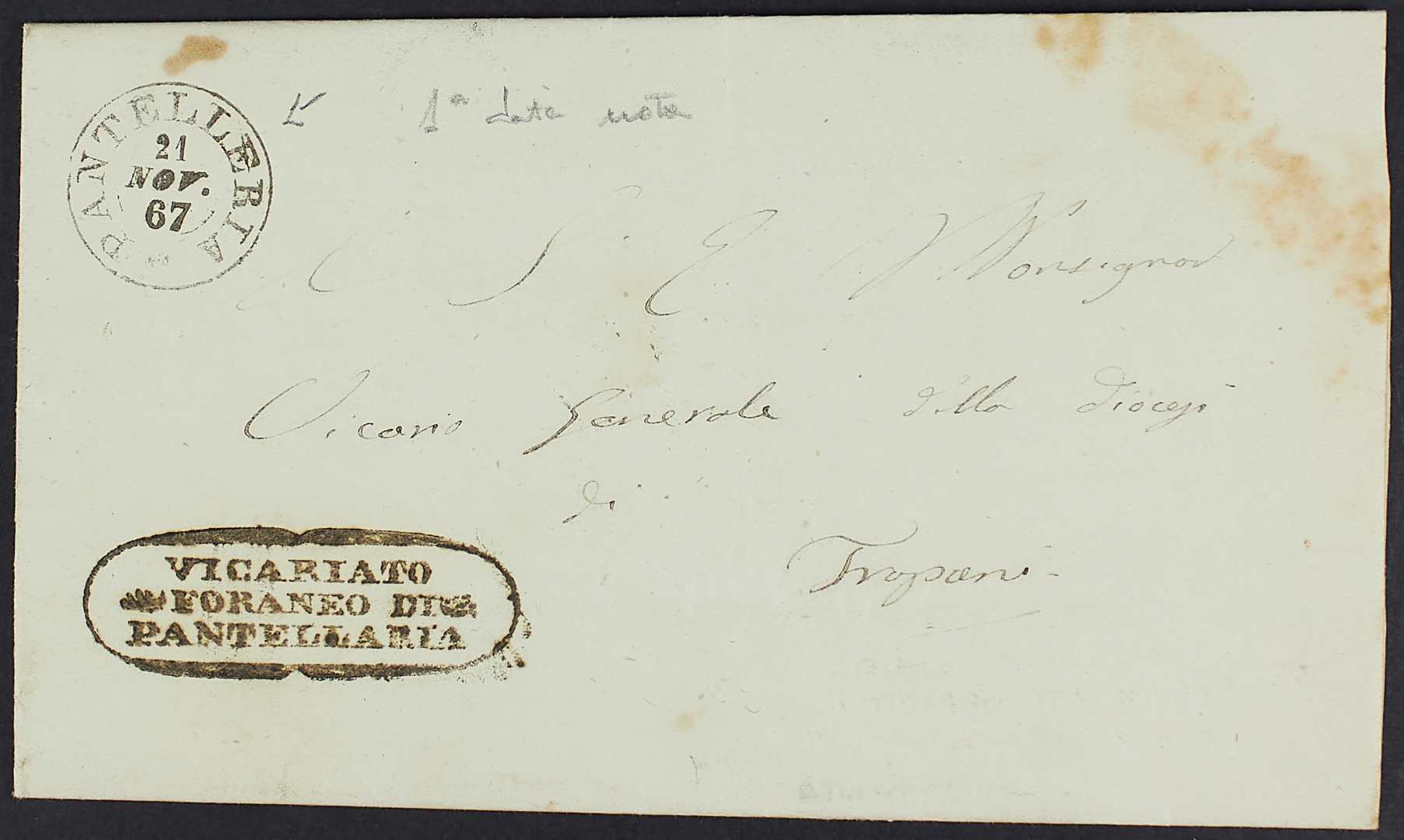 1867 - Pantelleria - Cerchio su involucro di lettera non affrancata del 21 novembre per Trapani - Probabile prima data nota (non sono segnalati usi antecedenti al 1868)