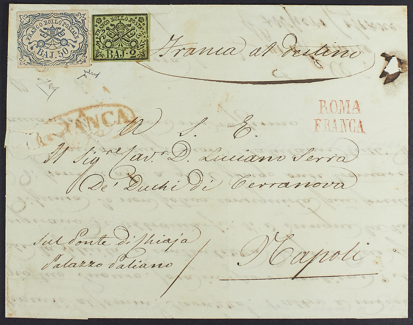 1852 - 2 baj. verde oliva + 50 baj. azzurro su lettera del 20 novembre da Roma per Napoli - Francobolli sfuggiti entrambi all'annullamento - Rara - Cert. Diena - Firma Chiavarello