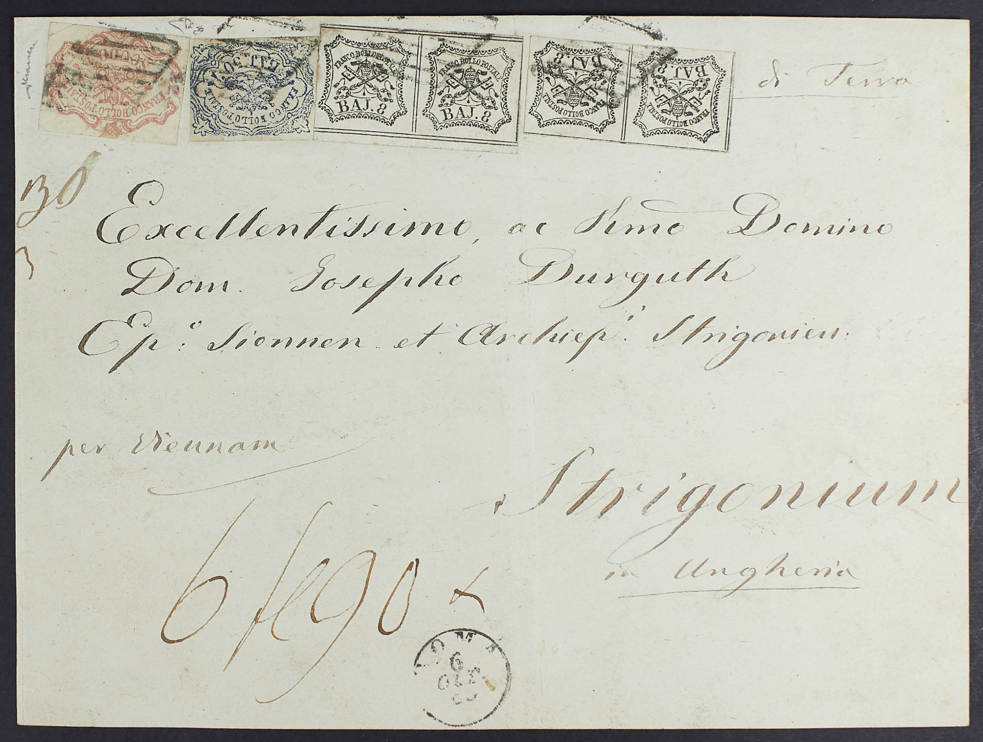 1852 - 80 baj. bianco due coppie orizzontali + 50 baj. azzurro oltremare scuro stampa difettosa + 1 s. rosa carminio in affrancatura "tricolore" su frontespizio di lettera del 6 ottobre 1865 da Roma per l'Ungheria - 50 baj. corto nel lato destro e 1 s. riparato ma affrancatura di rarità estrema - Da esaminare - Cert. Diena - Firma Chiavarello