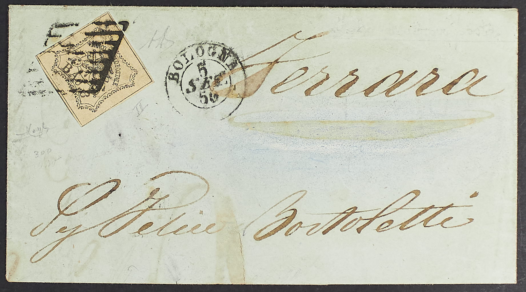 1855 - 8 baj. bianco II tipo su lettera del 5 settembre 1856 da Bologna per Ferrara - Cert. Raybaudi - Firma A.D.