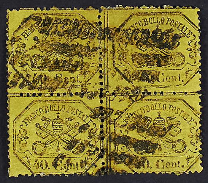 1868 - 40 c. giallo limone blocco di quattro usato - Due blocchi noti - Uniti tre esemplari sciolti nuovi in varie gradazioni di colore e uno usato su piccolo frammento - Cert. Diena
