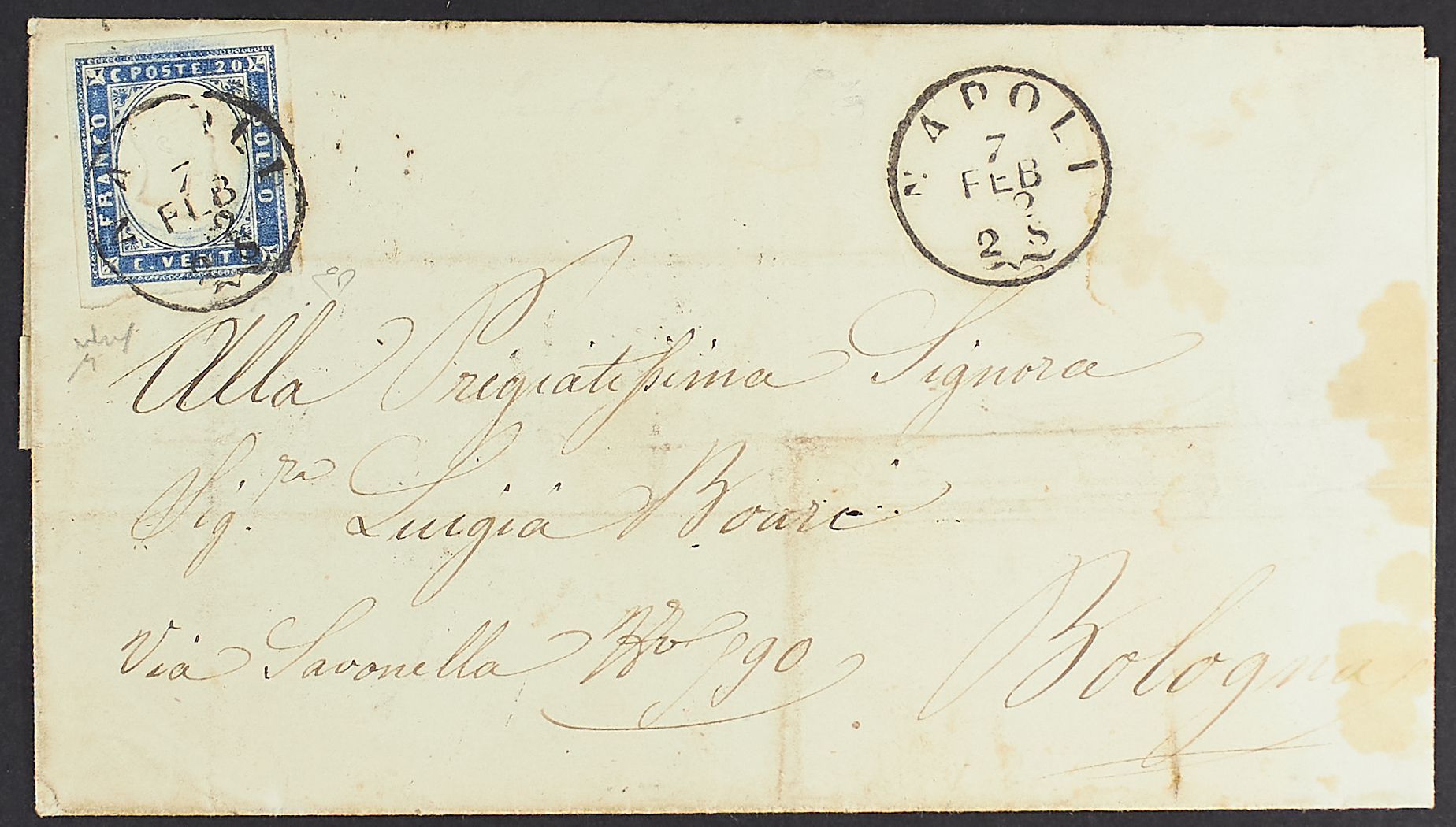 1855 - 20 c. celeste su lettera del 7 febbraio 1862 da Napoli per Bologna - Uso anticipato di francobolli degli Stati Sardi nelle Province Napoletane dove le emissioni con valore in moneta italiane furono introdotte solo dal 1° ottobre 1862 - Da esaminare - Cert. Diena - Firma Chiavarello