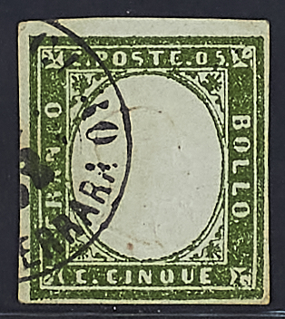 1855 - 5 c. verde olivastro con doppia effigie di cui una capovolta - Cert. Sorani - Firme Chiavarello e Savarese