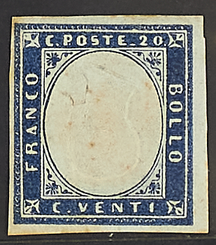 1855 - 20 c. azzurro oltremare nuovo + 20 c. azzurro grigio su piccolo frammento - Da esaminare - Cert. Raybaudi - Firme Chiavarello, E. Diena e A.D.