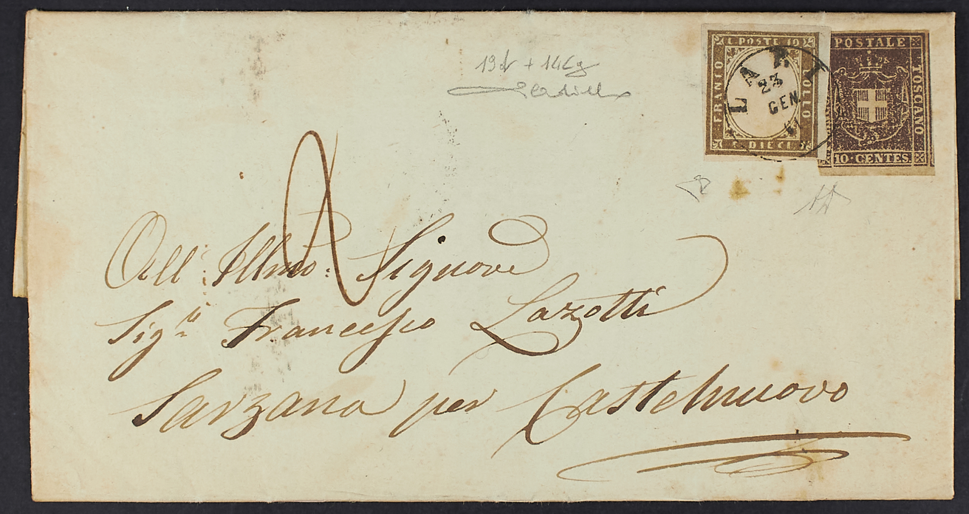 1860 - 10 c. bruno lillaceo in affrancatura mista con Sardegna IV emissione 10 c. bruno grigio olivastro ("valori gemelli") su lettera del 23 gennaio 1861 da Lari per Castelnuovo - Rara - Cert. Cardillo - Firme A.D. e En. D