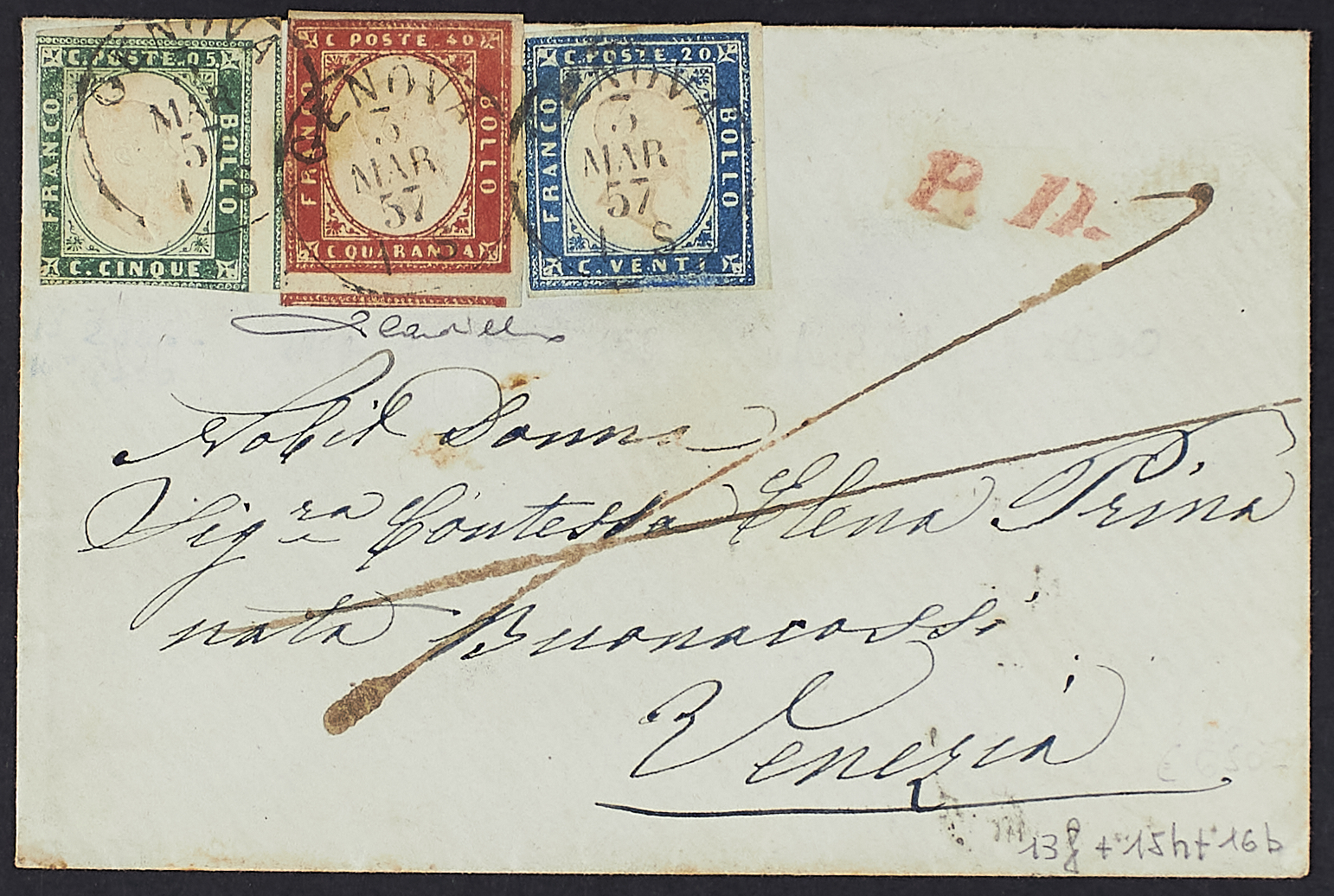 1855 - 5 c. verde smeraldo scuro + 20 c. celeste vivace + 40 c. vermiglio scuro in affrancatura "tricolore" su lettera del 3 marzo 1857 da Genova per Venezia - Non comune - Da esaminare - Cert. Cardillo