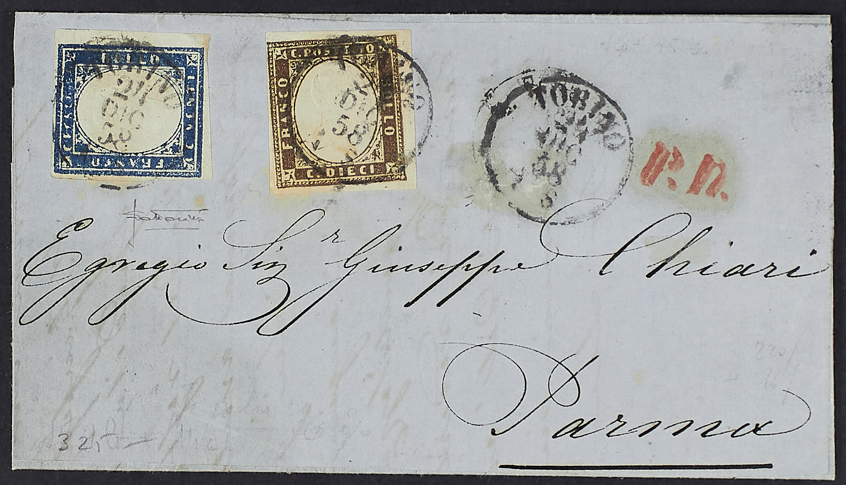 1855/58 - 10 c. terra D'ombra giallognolo + 20 c. azzurro grigiastro su lettera del 24 dicembre 1858 da Torino per Parma - Firma Sottoriva