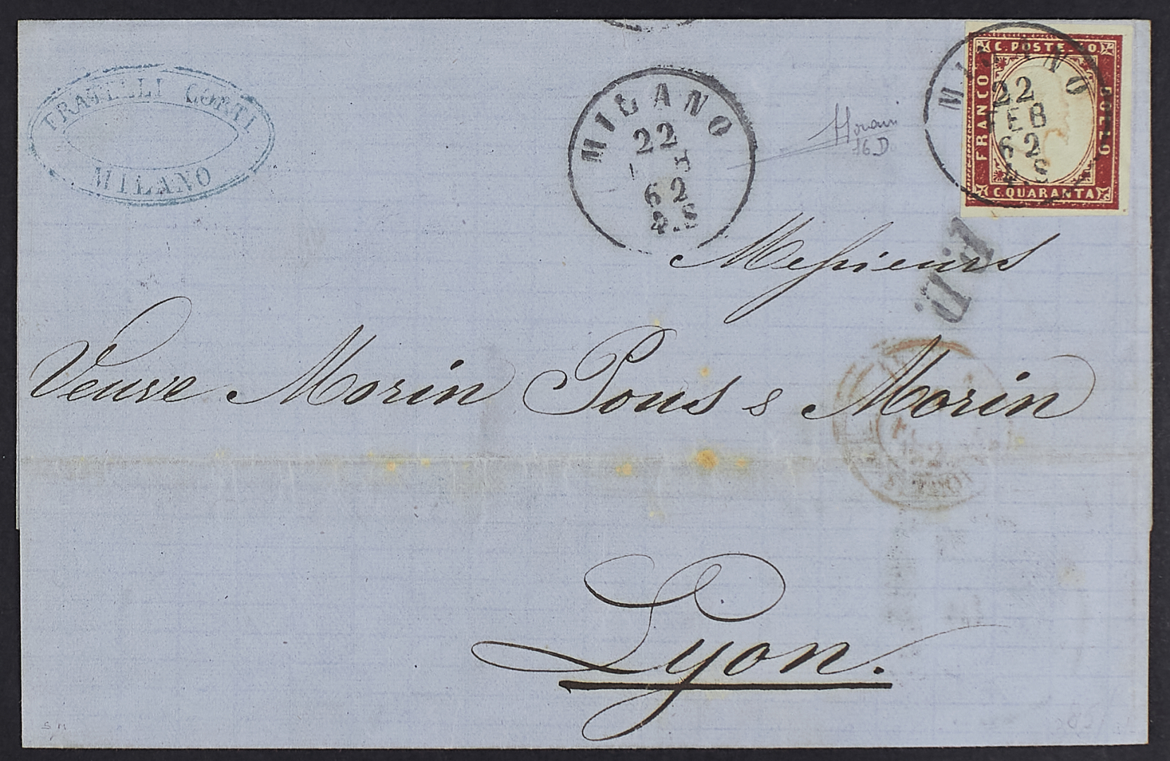 1855 - 40 c. rosso - Sette lettere per la Francia affrancate con l'esemplare singolo (una delle quali con il 40 c. della prima emissione dentellata del Regno) viaggiate negli anni 1862/64 - Firme A.D. e Raybaudi