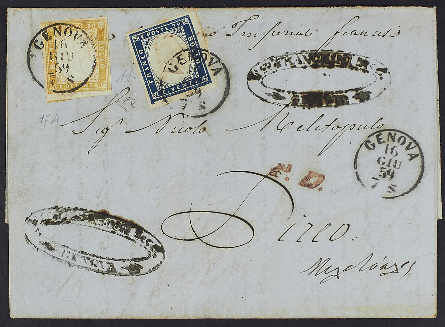 1855/58 - 20 c. azzurro scuro + 80 c. giallo ocra pallido su lettera del 16 giugno 1859 da Genova per Pireo - Cert. Diena
