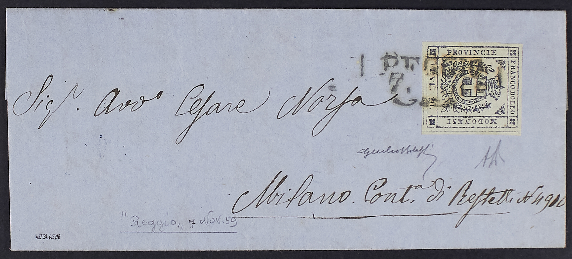 1859 - 20 c. nero violaceo su lettera del 7 novembre da Reggio per Milano - Cert. Bolaffi - Firma A.D.