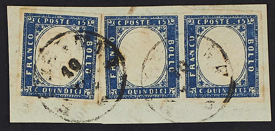 1863 - Tipo Sardegna 15 c. azzurro coppia orizzontale ed esemplare singolo su piccolo frammento - Unito esemplare sciolto nella gradazione cromatica azzurro grigio con annullo di Castellarano del 1° gennaio (giorno di emissione)