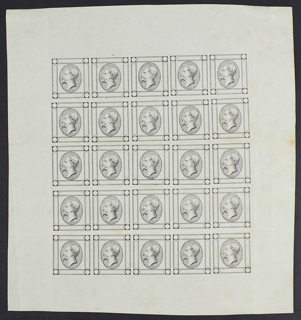 1863 - Litografico 15 c. - Foglietto intero di 25 esemplari uguale al tipo adottato ma privo di dicitura - Stampato in nero su carta sottile - Due soli foglietti noti - Alcune pieghe - Da esaminare - Cert. Diena