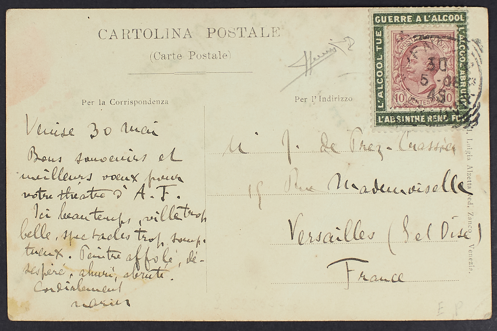 1906 - Leoni 10 c. montato al centro di etichetta adesiva dentellata di propaganda anti - alcolica (testo in francese) su cartolina del 30 maggio 1908 da Venezia per Versailles - Rara - Cert. Diena e Sorani