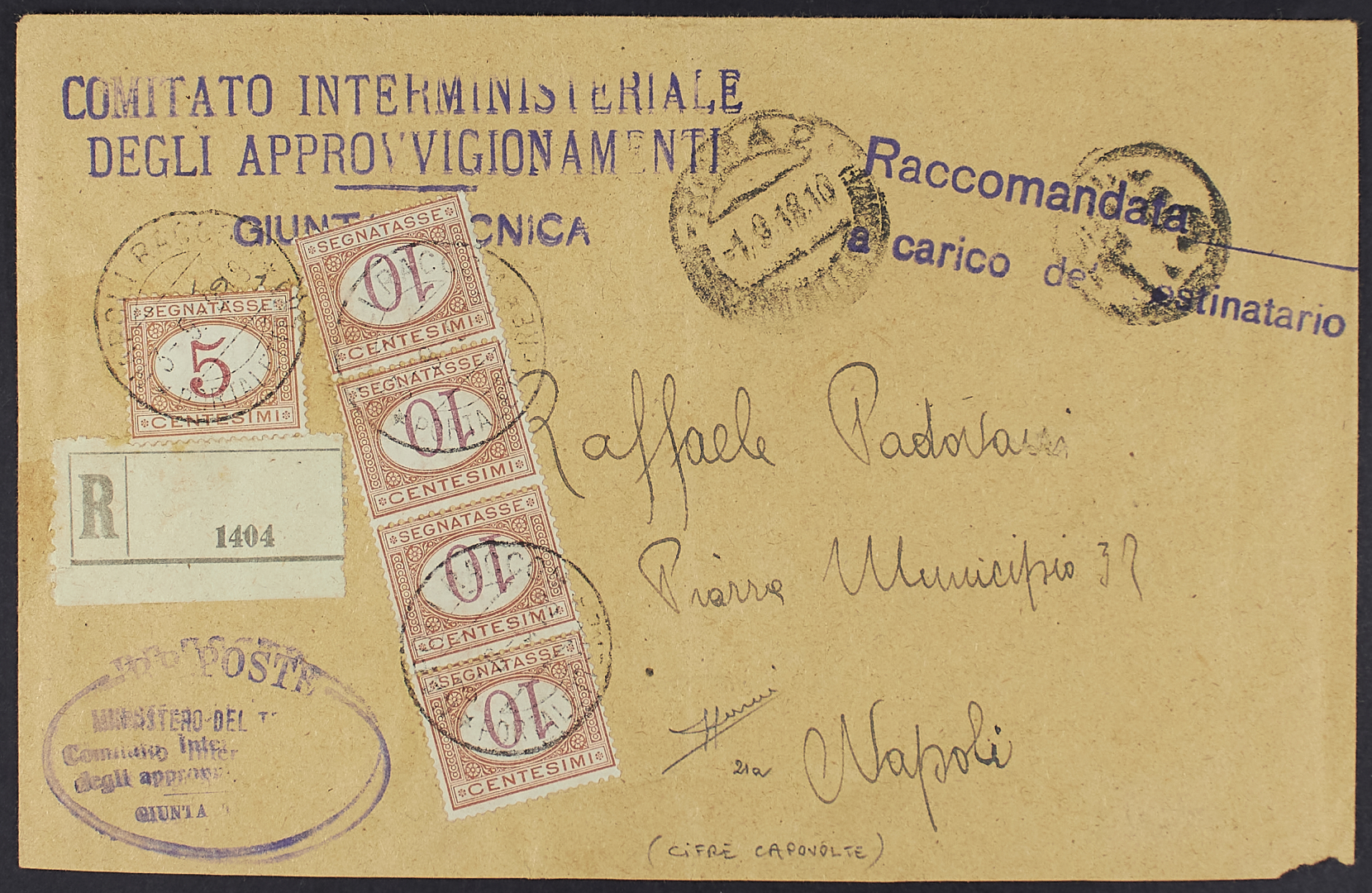 1890 - Definitiva 5 c. arancio e carminio + 10 c. arancio e carminio cifra capovolta striscia verticale di quattro esemplari su raccomandata con tassa a carico del destinatario del 1° settembre 1918 da Roma per Napoli - Rara - Cert. Sorani