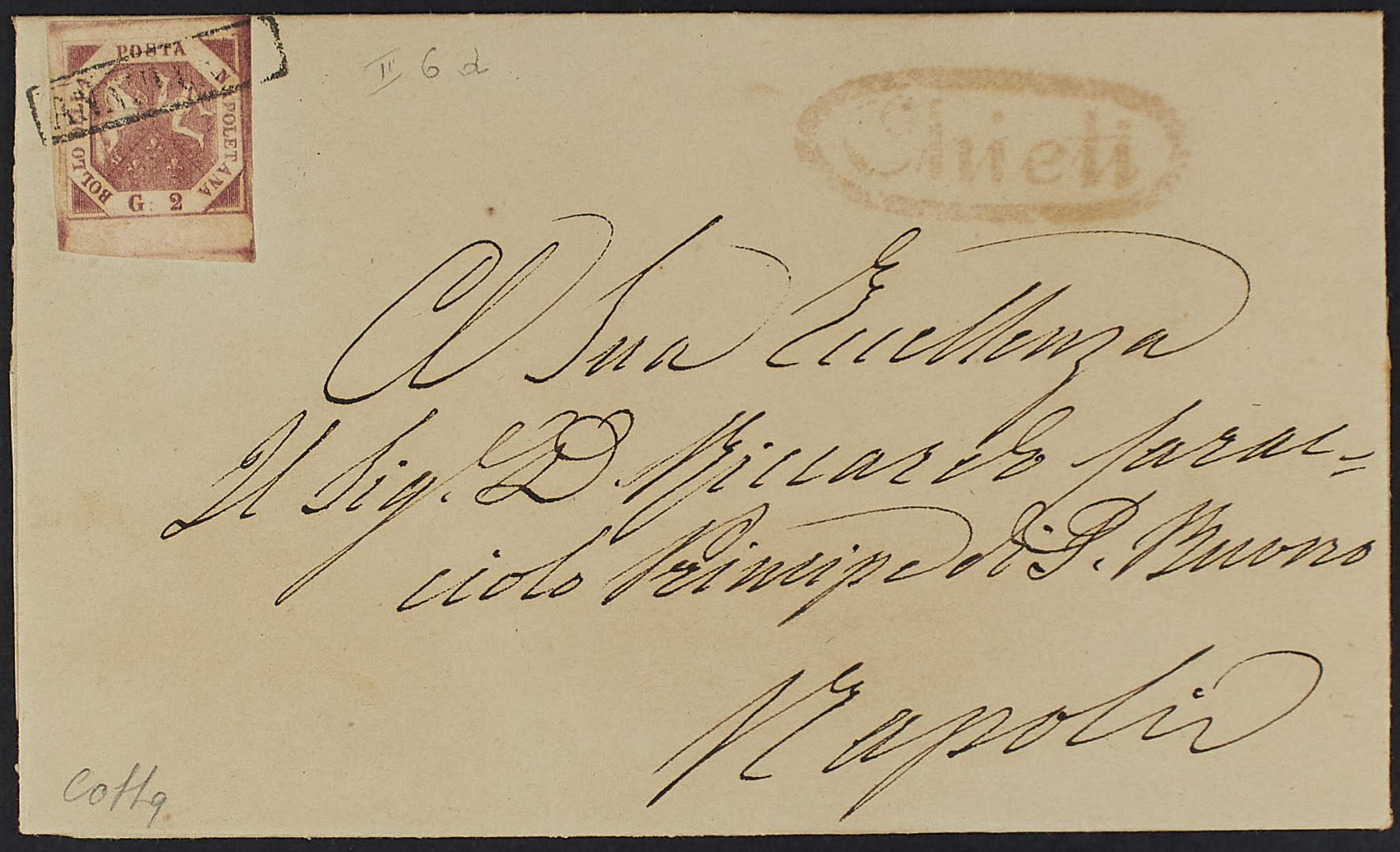 1858 - 2 gr. II tavola carminio mattone bordo di foglio inferiore su lettera del 19 agosto da Chieti per Napoli - Splendida - Cert. Colla