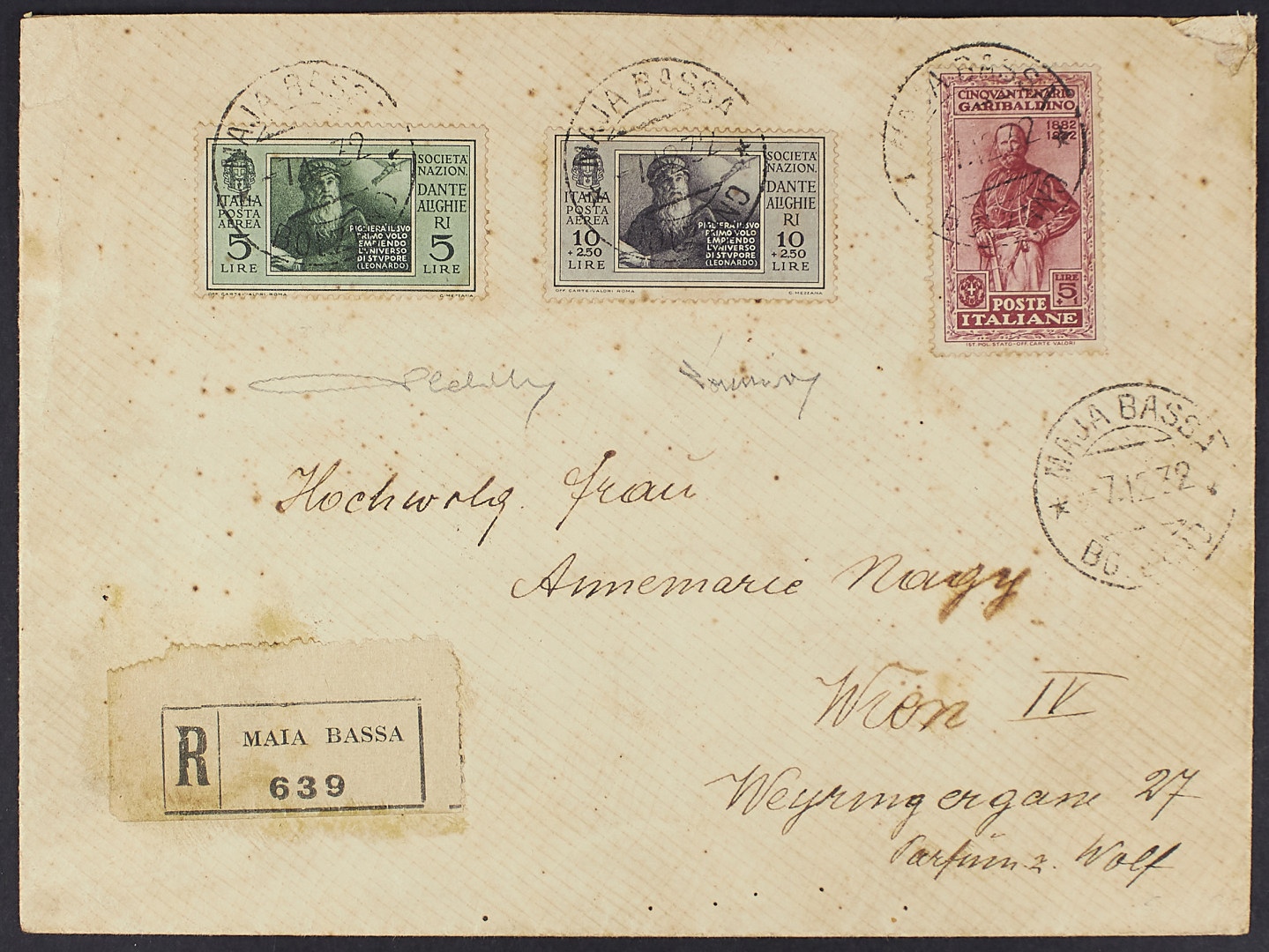 1932 - Dante 5 L. + 10 L. e Garibaldi 5 L. di posta ordinaria su raccomandata del 7 dicembre da Bolzano per Vienna - Da esaminare - Cert. Cardillo