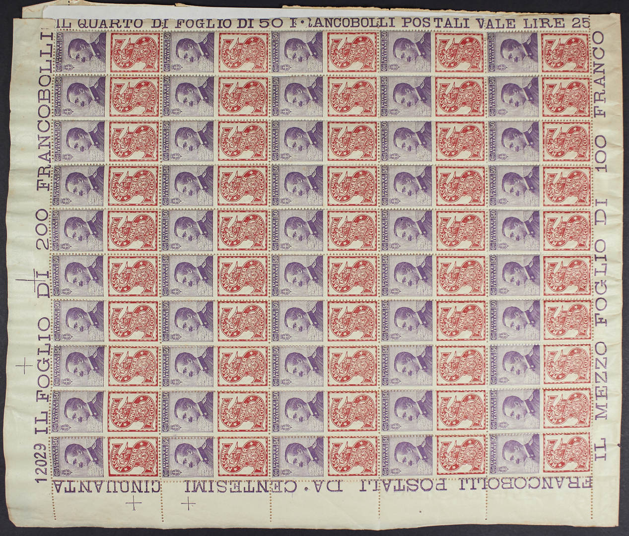 1924 - 50 c. Singer - Il doppio foglio (verticale) di cento esemplari - Unito altro foglio singolo di 50 esemplari senza margine sinistro - Da esaminare