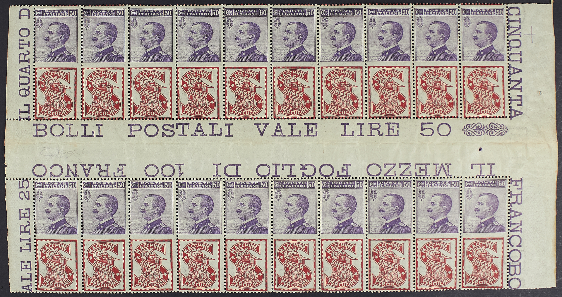 50 C. SINGER BLOCCO ORIZZONTALE DI VENTI ESEMPLARI CON INTERSPAZIO DI GRUPPO CENTRALE