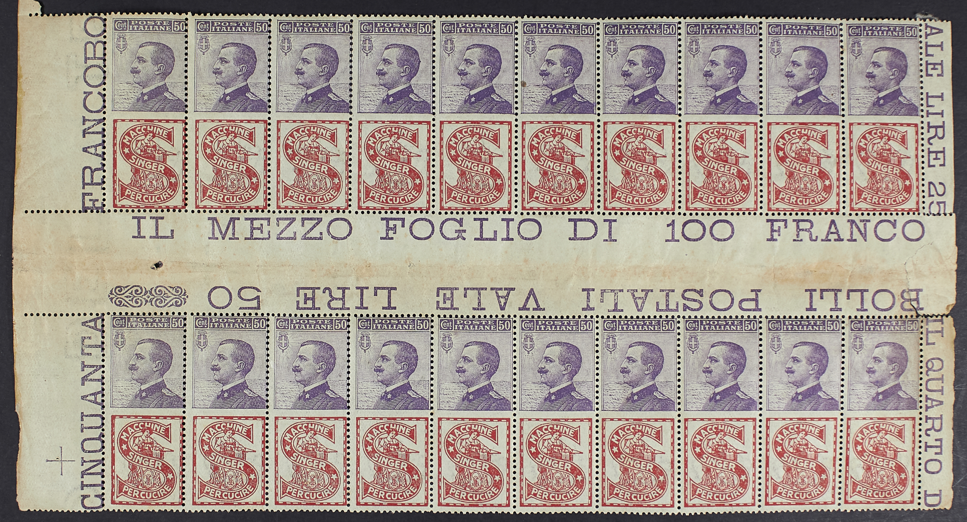 50 C. SINGER BLOCCO ORIZZONTALE DI VENTI ESEMPLARI CON INTERSPAZIO DI GRUPPO CENTRALE