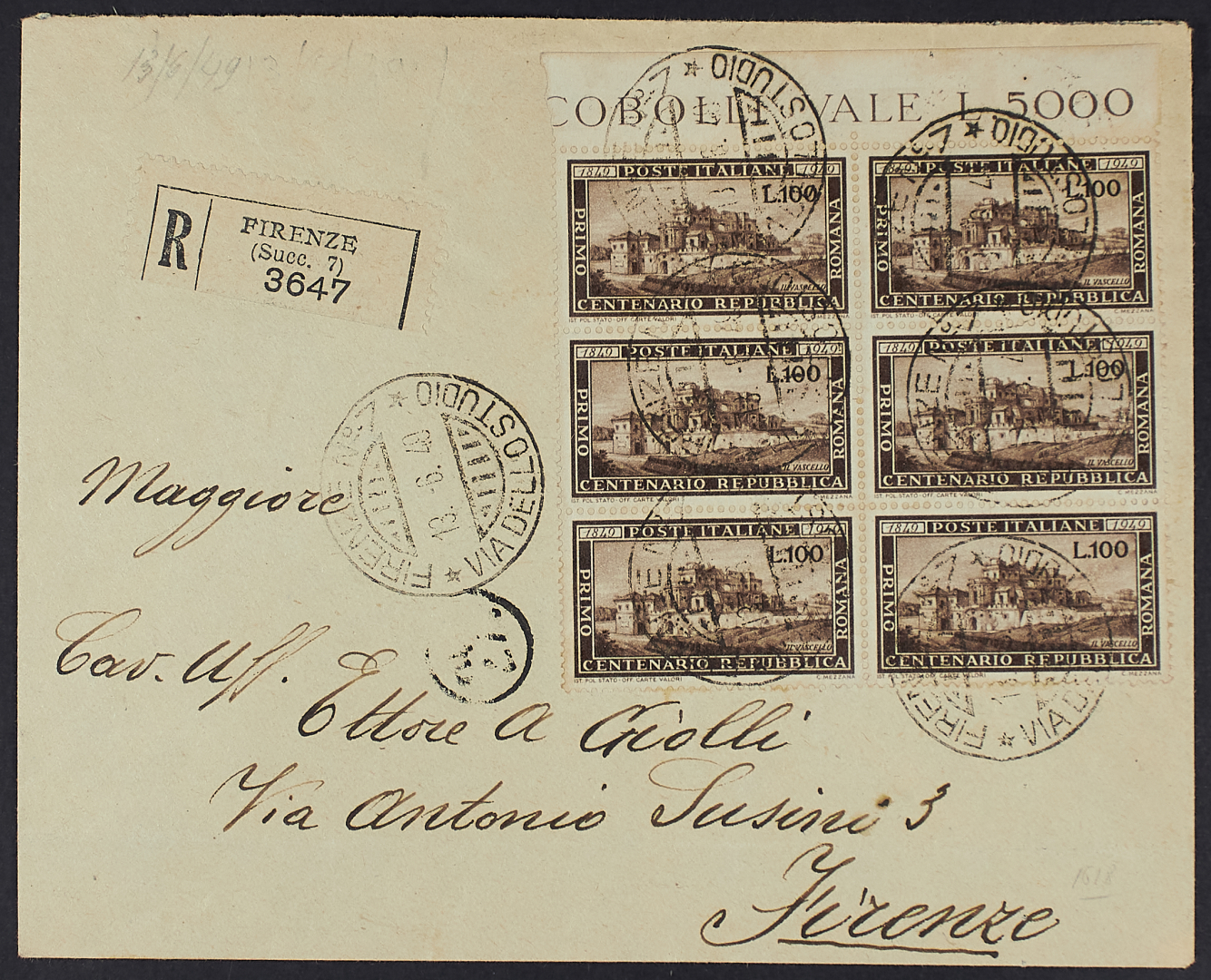 1949 - Repubblica Romana 100 L. blocco verticale di sei esemplari bordo di foglio superiore su raccomandata del 13 giugno da Firenze per città - Rara