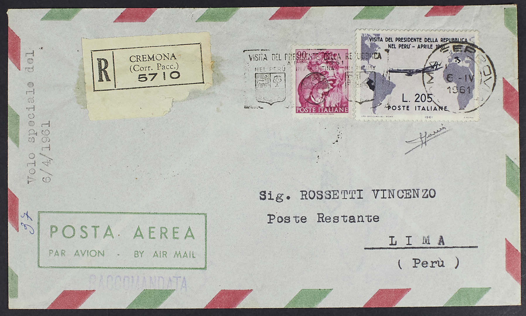 1961 - L'aerogramma con l'esemplare ricoperto e timbro di arrivo a Lima - Uniti altri tre aerogrammi con 170 L. e 185 L. - Cert. Sorani e Zanaria