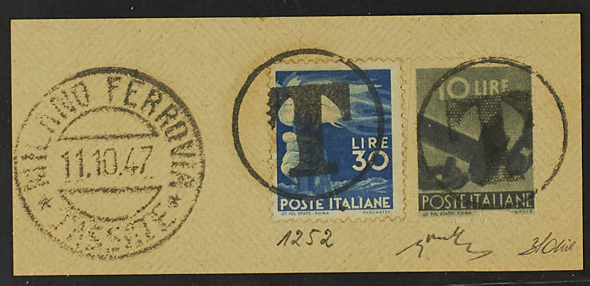 DEMOCRATICA 10 L. FALSO DI MILANO IN AFFRANCATURA CON 30 C. SU PICCOLO FRAMMENTO