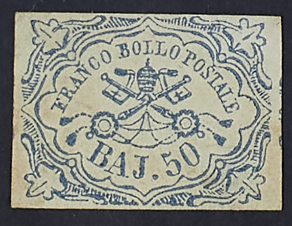 1852 - 50 baj. azzurro - Ottimi margini - Cert. Diena e Sorani - Firma Zanaria