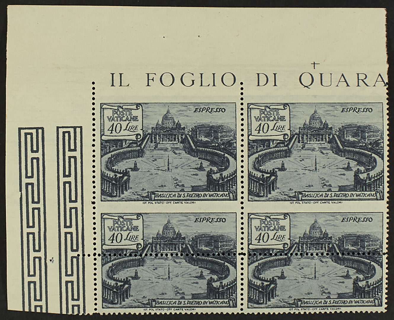 1949 - Basiliche 40 L. blocco di quattro angolo di foglio superiore sinistro non dentellato al centro e in alto o con la dentellatura centrale fortemente spostata in basso - Non comune - Da esaminare